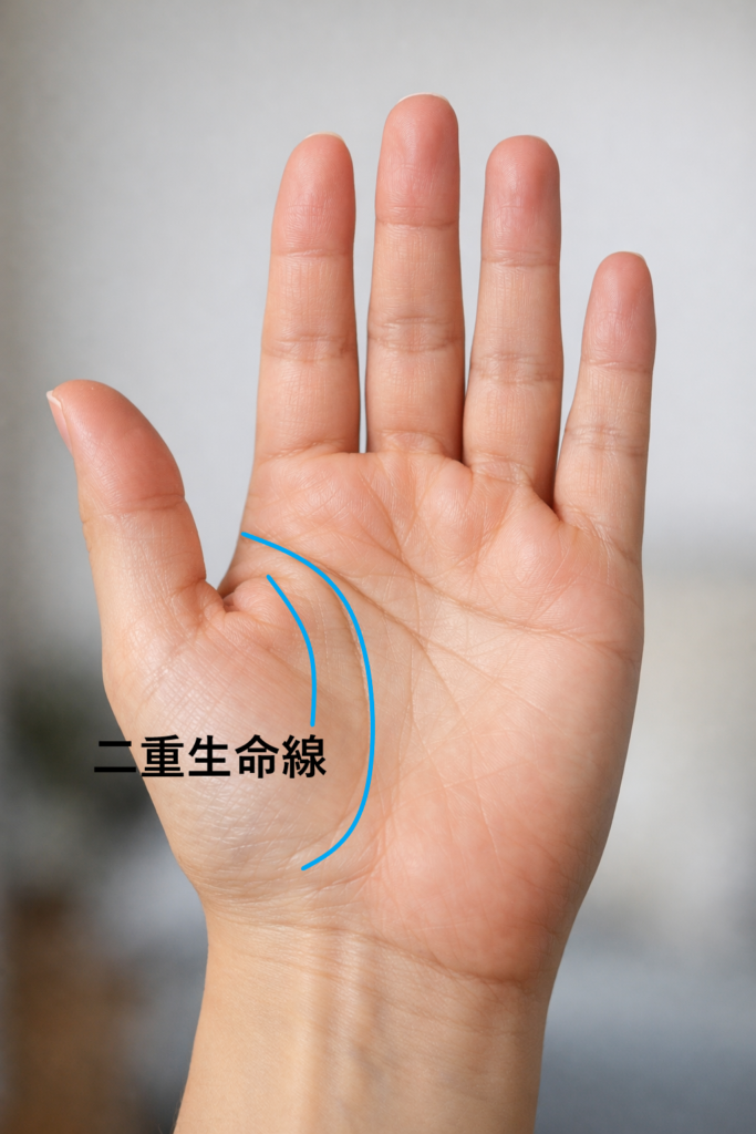 生命線の内側に、生命線とほぼ並行してもう一本線がある場合、一般的に 二重生命線(副生命線) と呼ばれることが多いです。