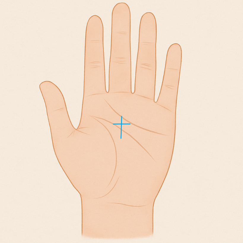 神秘十字は、手のひら中央付近、感情線と頭脳線の間(中指の下あたり)に出やすい「十字の形」をした相です。